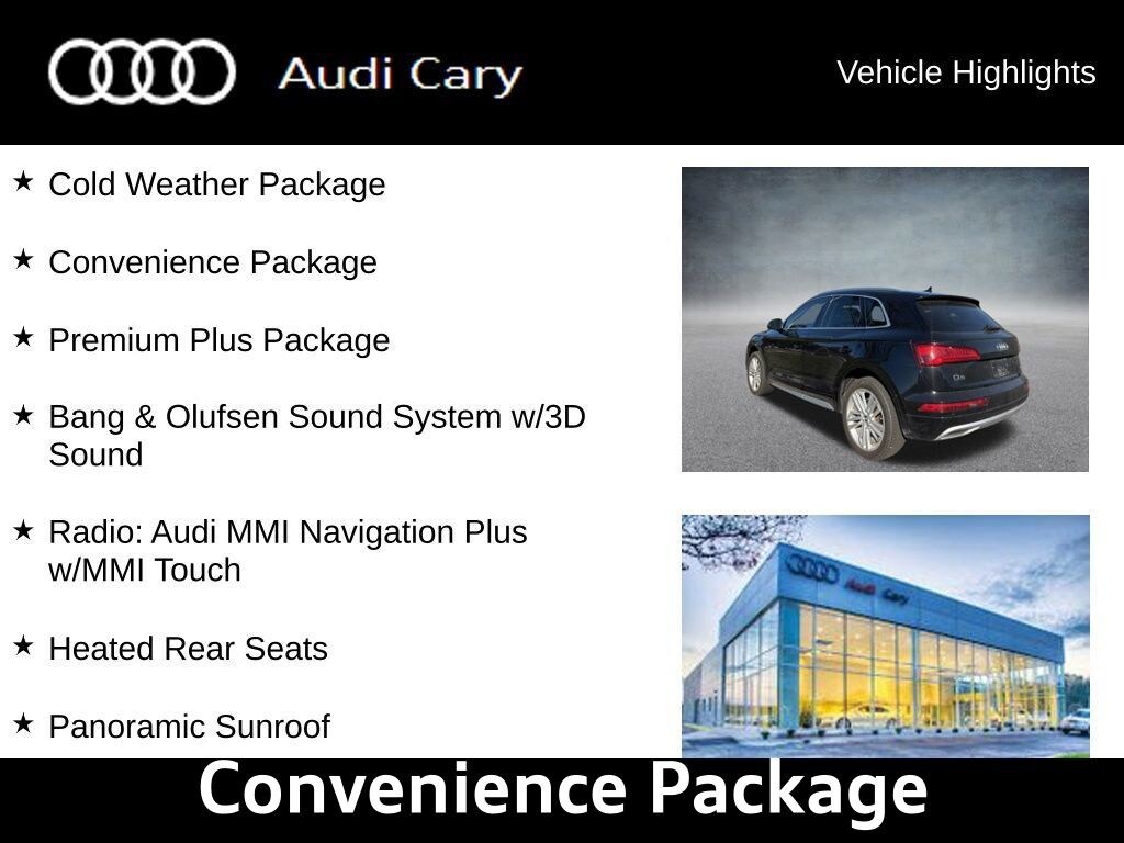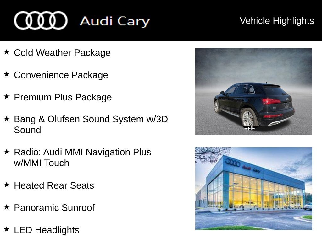 Brilliant Black 2019 Audi Q5 2.0T Premium Plus quattro 7-Speed Automatic S tronic 2.0L TFSI quattro CARFAX One-Owner. Clean CARFAX. Rock Gray w/Leather Seating Surfaces, All-Weather Floor Mats, Audi Beam-Rings, Audi Connect PRIME & PLUS, Audi Phone Box, Audi Virtual Cockpit, Bang & Olufsen Sound System w/3D Sound, Cold Weather Package, Convenience Package, Heated Rear Seats, Heated Steering Wheel, Leatherette Covered Center Console & Door Armrests, LED Headlights, Panoramic Sunroof, Parking System Plus (Front/Rear Acoustic Sensors), Premium Plus Package, Radio: Audi MMI Navigation Plus w/MMI Touch, Stainless Steel Door Sills, USB Charge Ports for Rear Seats, Wheels: 20" 5-Segment-Spoke Design.