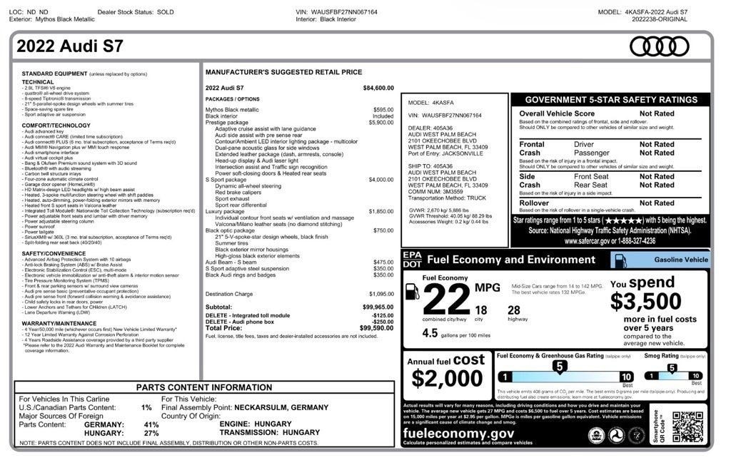 Black Metallic 2022 Audi S7 2.9T Prestige quattro 8-Speed Automatic with Tiptronic 2.9L V6 Turbocharged DOHC 24V LEV3-ULEV70 444hp quattro Clean CARFAX.