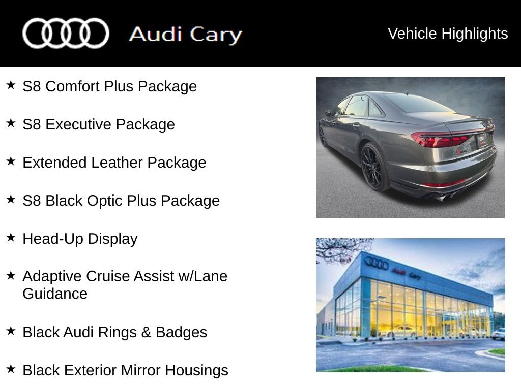Daytona Gray Pearl Effect 2023 Audi S8 4.0T quattro 8-Speed Automatic with Tiptronic 4.0L V8 Turbocharged DOHC 32V LEV3-ULEV125 563hp quattro CARFAX One-Owner. Clean CARFAX. Adaptive Cruise Assist w/Lane Guidance, Audi Side Assist w/Pre Sense Rear, Black Audi Rings & Badges, Black Dinamica Headliner, Black Exterior Mirror Housings, Digital Matrix-Design LED Headlights, Extended Leather Package, Head-Up Display, Heated Rear Outboard Seats, High-Gloss Black Exterior Elements, Intersection Assist, Remote Park Assist Plus, S8 Black Optic Plus Package, S8 Comfort Plus Package, S8 Executive Package, Traffic Sign Recognition, Wheels: 21" 10-Spoke Design w/Gloss Black Finish, Wheels: 21" 10-Spoke-Star Design.