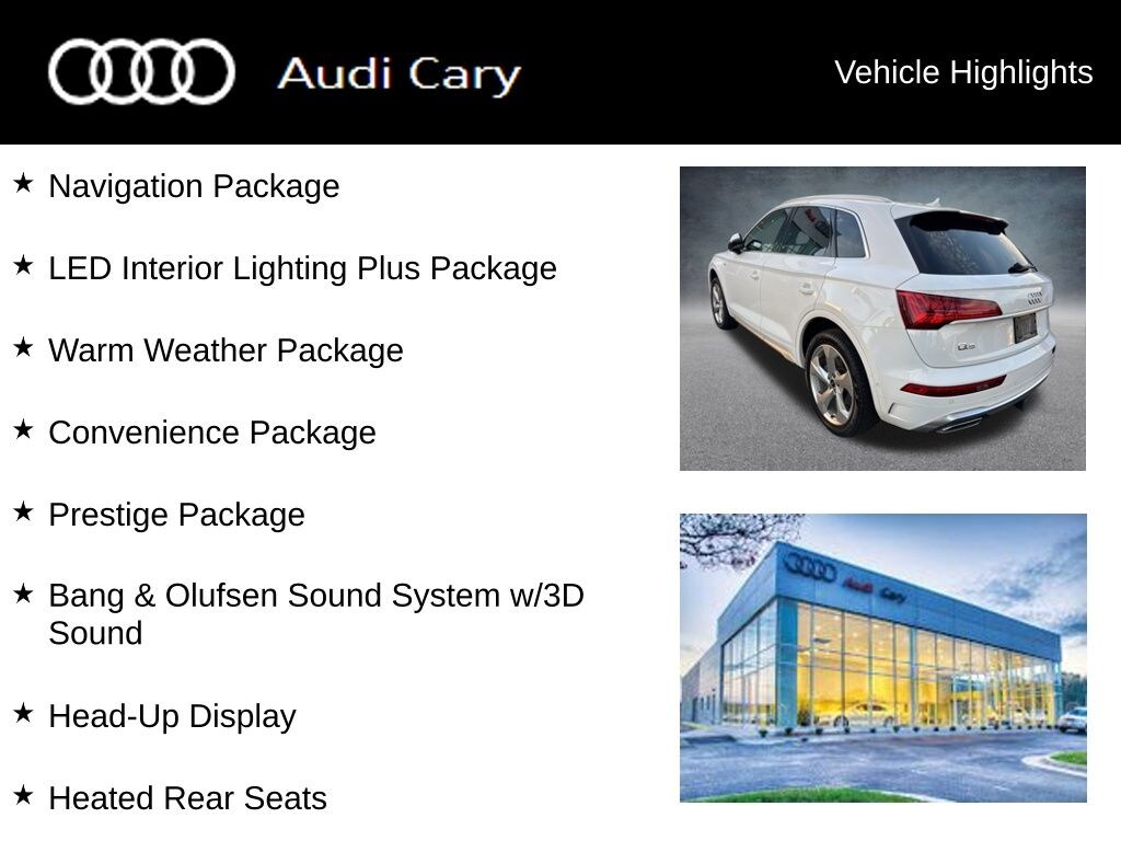 Arkona White 2024 Audi Q5 45 S line Prestige quattro 7-Speed Automatic S tronic 2.0L Turbocharged quattro CARFAX One-Owner. Clean CARFAX. Atlas Beige w/Leather Seating Surfaces, Audi Virtual Cockpit Plus, Bang & Olufsen Sound System w/3D Sound, Convenience Package, Dual Pane Acoustic Glass for Front Side Windows, Head-Up Display, Heated & Cooled Front Cup Holder, Heated Rear Seats, Leatherette Covered Center Console & Door Armrests, LED Interior Lighting Plus Package, Matrix-Design LED Headlights w/Headlight Washers, Navigation Package, Panoramic Sunroof, Park Assist, Power Adjustable Steering Column, Prestige Package, Top View Camera System, Trailer Hitch, Warm Weather Package, Wheels: 19" 5-Double-Arm Design Bi-Color Finish, Wireless Phone Charging Pad.