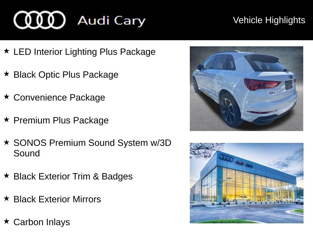 Glacier White Metallic 2025 Audi Q3 Premium Plus S Line quattro 8-Speed Automatic with Tiptronic 2.0L 4-Cylinder TFSI quattro CARFAX One-Owner. Clean CARFAX. Black Exterior Mirrors, Black Exterior Trim & Badges, Black Optic Plus Package, Black Roof Rails, Carbon Inlays, Convenience Package, Dinamica Upper Inlay & Door Armrests in Steel Gray, LED Interior Lighting Plus Package, Premium Plus Package, SONOS Premium Sound System w/3D Sound, Sport Front Bucket Seats w/S Embossing, Stainless Steel Pedal Caps, Top View Camera System, Wheels: 19" 7-Spoke-Rotor-Design.