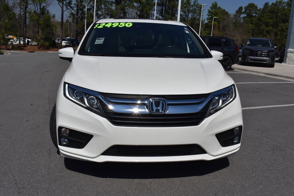 Clean CARFAX. CARFAX One-Owner. White Diamond Pearl 2019 Honda Odyssey EX-L FWD 9-Speed Automatic 3.5L V6 SOHC i-VTEC 24V 3rd row seats: split-bench, 4-Wheel Disc Brakes, 4.33 Axle Ratio, 7 Speakers, A/V remote: CabinControl, ABS brakes, Air Conditioning, Alloy wheels, AM/FM radio: SiriusXM, Anti-whiplash front head restraints, Apple CarPlay/Android Auto, Auto High-beam Headlights, Auto-dimming Rear-View mirror, Automatic temperature control, Blind Spot Information (BSI) System warning, Brake assist, Bumpers: body-color, Delay-off headlights, Driver's Seat Mounted Armrest, Dual front impact airbags, Dual front side impact airbags, Electronic Stability Control, Emergency communication system: HondaLink, Exterior Parking Camera Rear, Forward collision: Collision Mitigation Braking System (CMBS) + FCW mitigation, Four wheel independent suspension, Front anti-roll bar, Front dual zone A/C, Front fog lights, Fully automatic headlights, Garage door transmitter: HomeLink, Heated door mirrors, Heated Front Bucket Seats, Heated front seats, Illuminated entry, Knee airbag, Lane departure: Lane Keeping Assist System (LKAS) active, Leather Seat Trim, Leather steering wheel, Low tire pressure warning, Memory seat, Occupant sensing airbag, Outside temperature display, Overhead airbag, Panic alarm, Passenger seat mounted armrest, Power door mirrors, Power driver seat, Power Liftgate, Power moonroof, Power passenger seat, Power steering, Power windows, Radio data system, Radio: 160-Watt AM/FM/HD/SiriusXM Audio System, Rear air conditioning, Rear anti-roll bar, Rear window defroster, Rear window wiper, Reclining 3rd row seat, Remote keyless entry, Security system, Speed control, Speed-sensing steering, Speed-Sensitive Wipers, Split folding rear seat, Spoiler, Steering wheel mounted audio controls, Tachometer, Telescoping steering wheel, Tilt steering wheel, Traction control, Trip computer, Turn signal indicator mirrors, Variably intermittent wipers, Wheels: 18" Dark Silver-Painted Alloy.