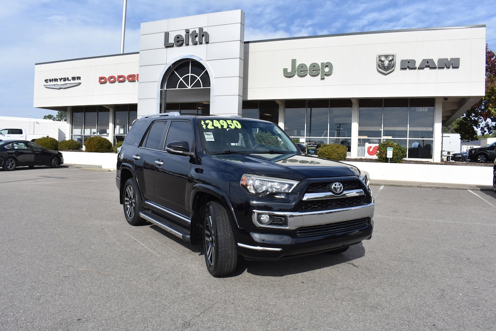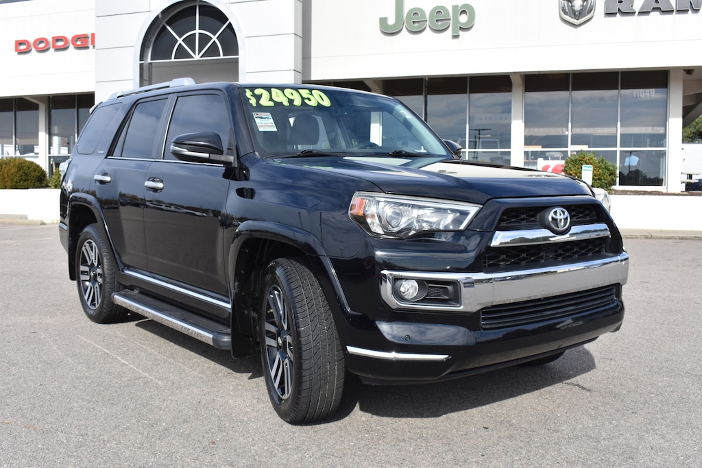 Midnight Black Metallic 2017 Toyota 4Runner Limited 4WD 5-Speed Automatic with Overdrive 4.0L V6 SMPI DOHC 15 Speakers, 20" x 7.5" Unique Dual 6-Spoke Alloy Wheels, 3.727 Axle Ratio, 4-Wheel Disc Brakes, ABS brakes, Air Conditioning, Alloy wheels, AM/FM radio: SiriusXM, Anti-whiplash front head restraints, Auto-Dimming Rear-View Mirror, Auto-dimming Rear-View mirror, Automatic temperature control, Body Color Heated Mirrors, Brake assist, Bumpers: body-color, CD player, Compass, Delay-off headlights, Dual front impact airbags, Dual front side impact airbags, Electronic Stability Control, Emergency communication system: Safety Connect, Exterior Parking Camera Rear, Front anti-roll bar, Front dual zone A/C, Front fog lights, Front wheel independent suspension, Fully automatic headlights, Garage Door Opener, Garage door transmitter: HomeLink, Heated door mirrors, Heated front seats, Heated/Ventilated Front Bucket Seats, Illuminated entry, Knee airbag, Leather Seat Trim, Leather Shift Knob, Limited Package, Low tire pressure warning, Memory seat, Moonroof w/Tilt Up & Slide, Mudguards, Navigation System, Occupant sensing airbag, Outside temperature display, Overhead airbag, Overhead console, Panic alarm, Power door mirrors, Power driver seat, Power moonroof, Power passenger seat, Power steering, Power windows, Radio: Entune Premium JBL Audio w/Navigation, Rear anti-roll bar, Rear window defroster, Rear window wiper, Remote Engine Starter, Remote keyless entry, Right & Left Individual Air Conditioner, Roof rack: rails only, Running Boards, Security system, Speed control, Speed-sensing steering, Split folding rear seat, Spoiler, Steering wheel mounted audio controls, Tachometer, Telescoping steering wheel, Tilt steering wheel, Traction control, Trip computer, Turn signal indicator mirrors, Variably intermittent wipers, Ventilated front seats.