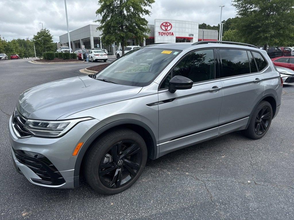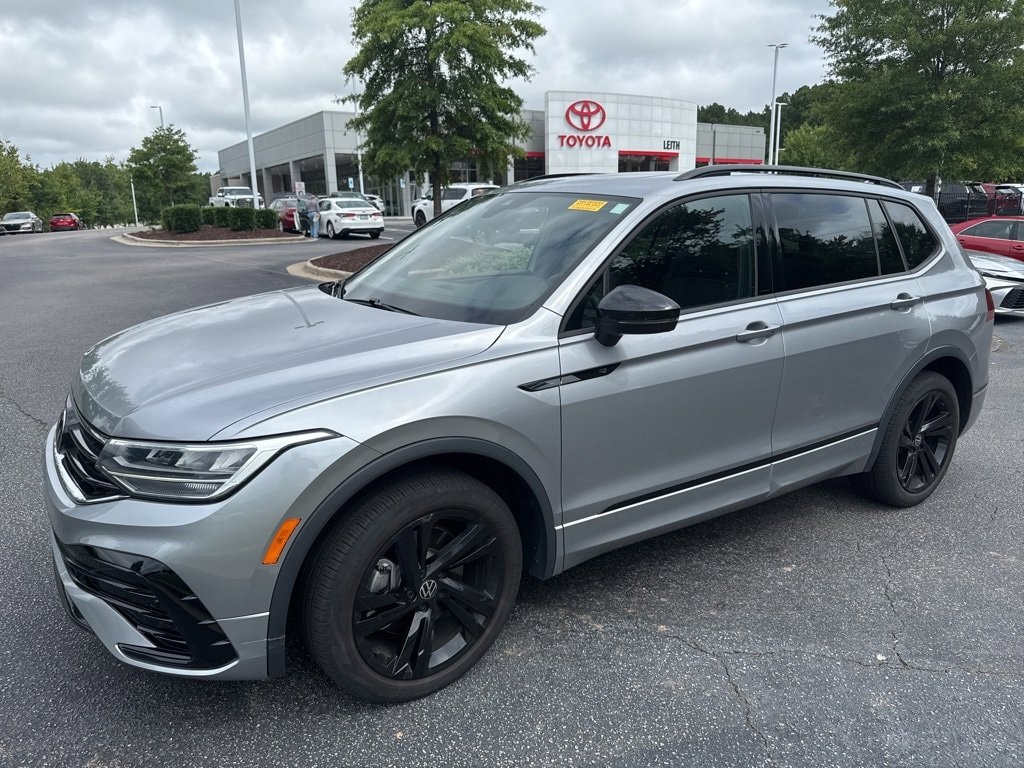 CARFAX One-Owner. Pyrite Silver Metallic 2023 Volkswagen Tiguan 2.0T SE R-Line Black FWD 8-Speed Automatic with Tiptronic 2.0L TSI DOHC LOCAL TRADE IN, BACK UP CAMERA, LEATHER, HEATED SEATS, PANORAMIC SUNROOF, THIRD ROW SEAT, BLIND SPOT MONITOR, SMART KEY W PUSH BUTTON START, LANE DEPARTURE ALERT W STEERING ASSIST, APPLE CARPLAY & ANDROID AUTO, POWER LIFTGATE, MUST SEE TO APPRECIATE!, 3-Row Rubber Monster Mats w/Logo Kit (Set of 5), 3rd row seats: bench, 4-Wheel Independent Suspension, ABS brakes, Air Conditioning, Compass, Credit - Power Rear Liftgate Removed, Credit - Steering Wheel Substitution, Electronic Stability Control, Exterior Parking Camera Rear, Four wheel independent suspension, Front dual zone A/C, Fully automatic headlights, Heated Front Comfort Seats, Heavy Duty Trunk Liner w/VW CarGo Blocks, Leather Shift Knob, Leather steering wheel, Perforated V-Tex Leatherette Seating Surfaces, Power driver seat, Power Liftgate, Power moonroof, Power steering, Power windows, Radio: MIB3 Composition Media AM/FM/HD, Steering wheel mounted audio controls, Telescoping steering wheel, Traction control, Turn signal indicator mirrors, Wheels: 19 Black Painted Twin 5-Spoke Alloy.